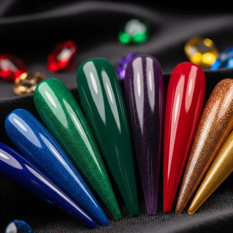 Channel your inner royalty with deep jewel tone acrylics that exude luxury and sophistication. Rich emerald greens, sapphire blues, amethyst purples, and ruby reds create a manicure fit for a queen. These saturated colors have incredible depth that makes nails look like actual precious gems. The key to nailing this look is choosing high-quality polishes with excellent pigmentation and adding a glossy topcoat for maximum shine. Jewel tones work beautifully on their own but can also be combined for a regal color palette. Add gold accents or rhinestones to enhance the luxurious feel. These colors are particularly stunning in fall and winter but make a bold statement any time you want to feel like absolute royalty.