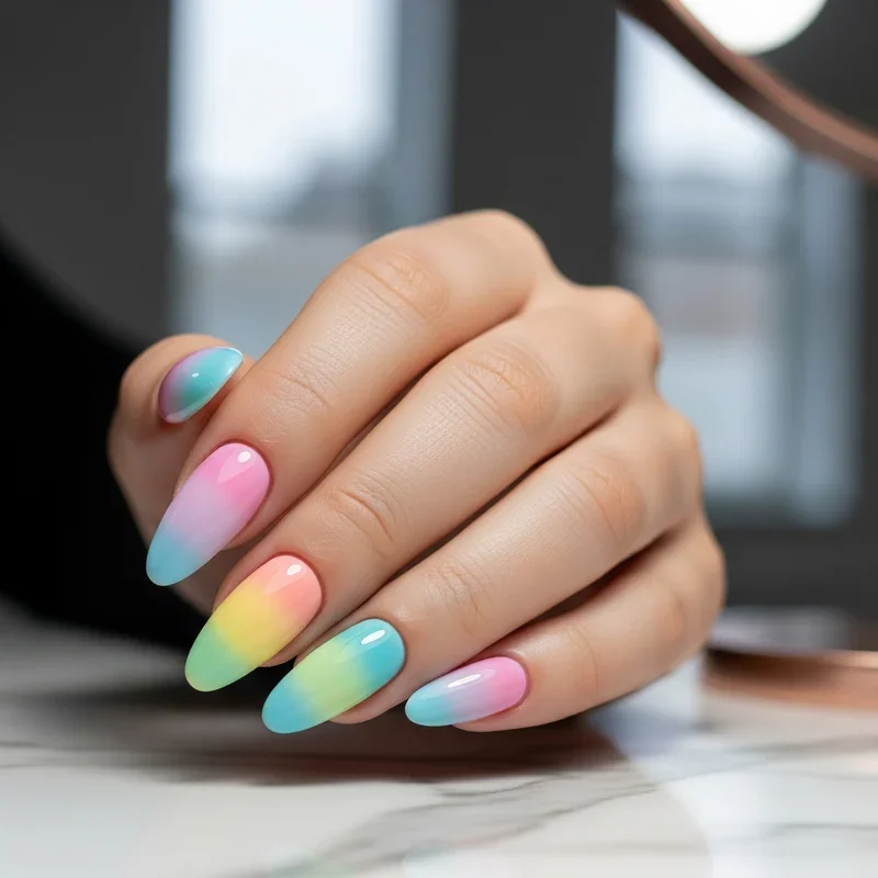 Why choose one pastel shade when you can have them all? Pastel rainbow nails bring a dose of whimsy and joy to your fingertips with soft, dreamy colors that make everyone smile. Each nail gets its own pastel shade, creating a gentle gradient from thumb to pinky. Think baby blue, lavender, mint green, peach, and butter yellow working together in perfect harmony. The muted tones keep the look sophisticated rather than childish, making it appropriate for any age. You can enhance the design with subtle shimmer topcoats or add tiny white clouds and stars for a celestial vibe. This cheerful style is perfect for spring and summer but honestly works year-round for anyone who refuses to let gray days dull their sparkle.