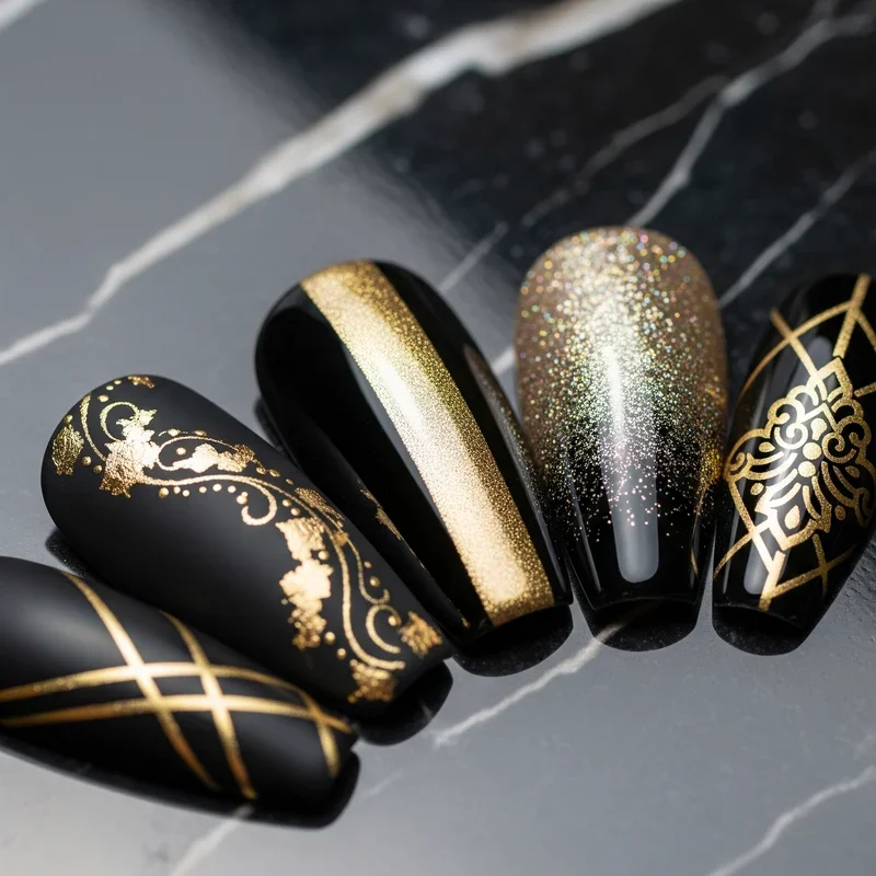 The combination of black and gold on nails is like the little black dress of manicures; it's classic, sophisticated, and always appropriate. This timeless pairing offers endless design possibilities, from simple gold stripes on black nails to intricate gold leaf patterns. You can create negative space designs where gold polish fills geometric cutouts in black, or try marble effects mixing both colors. For special occasions, add gold glitter or metallic accents to make the design pop even more. The contrast between mysterious black and luxurious gold creates drama without being overwhelming. This color combination works perfectly for formal events but is chic enough for everyday wear when you want to feel particularly put-together.