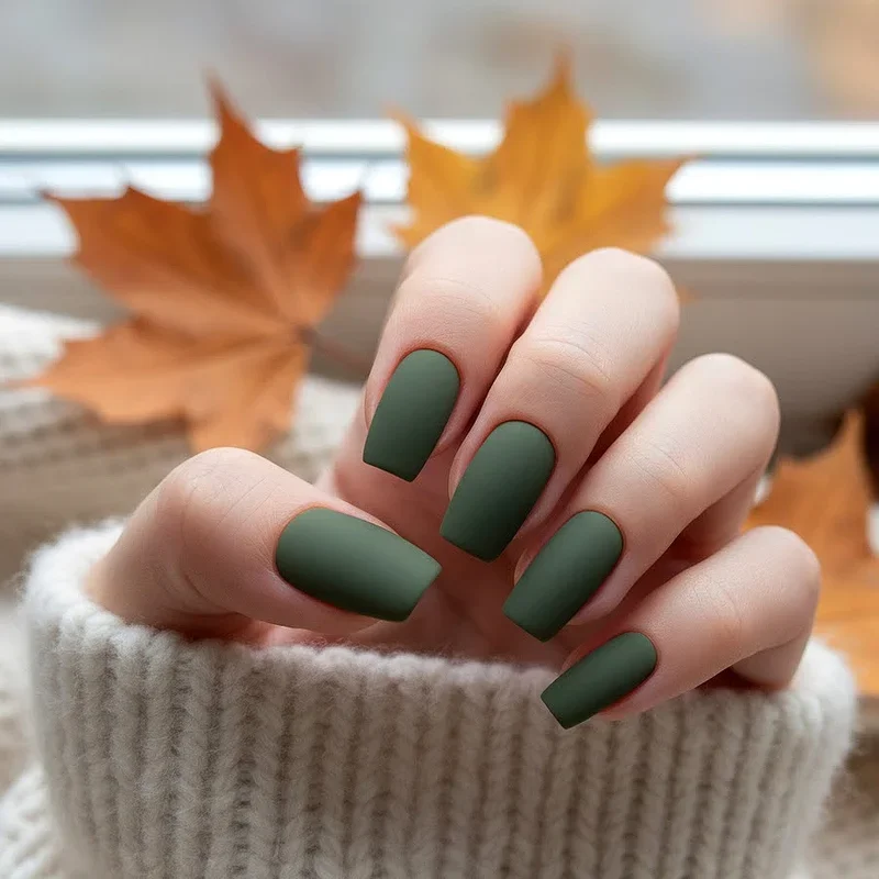 Olive green in a matte finish offers an edgy, contemporary take on autumn nails that feels fresh, modern, and unexpectedly versatile. This muted green shade brings military-inspired style to your fingertips while remaining soft enough for everyday wear throughout the season. Matte olive green pairs beautifully with gold accents, creating a luxurious combination that feels both earthy and elevated simultaneously. The color works wonderfully for those who want to embrace autumn tones without gravitating toward the expected oranges and burgundies. Consider adding a glossy topcoat to just one or two accent nails for an interesting contrast of finishes that adds dimension. Olive green complements both warm and cool skin tones, making it an inclusive shade that looks stunning on absolutely everyone who tries it.