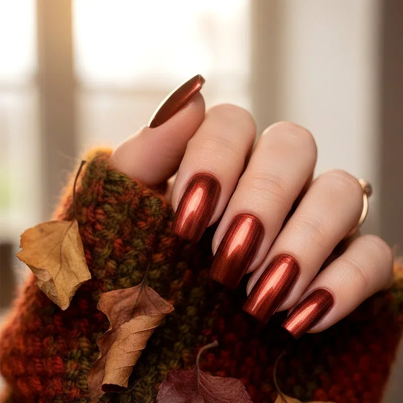 Copper metallic nails bring warmth and shine together, creating a stunning effect that catches light beautifully and screams autumn sophistication. This metallic shade sits between gold and bronze, offering unique warmth that complements the season's color palette perfectly and universally. Copper works beautifully as a full manicure or as an accent color paired with deep greens, burgundies, or chocolate browns. The reflective quality of metallic polish creates the illusion of longer, more elegant nails regardless of your natural nail length. Consider using copper chrome powder over a black base for an intense, mirror-like finish that's absolutely show-stopping and modern. Copper metallic nails pair exceptionally well with both casual and formal autumn outfits, making them versatile for any occasion you have planned.