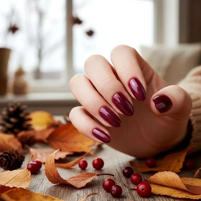 Cranberry wine shades offer a slightly brighter, more vibrant alternative to burgundy while maintaining that rich, sophisticated autumn feel we crave. This jewel-toned color brings life and energy to your fingertips, working beautifully for both daytime activities and evening events throughout fall. Cranberry's pink undertones make it particularly flattering on various skin tones, adding warmth without appearing too dark or heavy. You can wear this shade alone for maximum impact or pair it with gold glitter on accent nails for festive occasions. The color pairs wonderfully with gray, navy, and forest green in your autumn wardrobe, creating cohesive, put-together looks effortlessly. Consider alternating between glossy and matte finishes on different nails for added visual interest and a modern, editorial-inspired appearance.