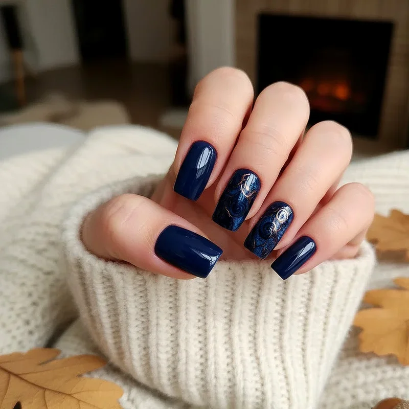 Navy blue brings unexpected sophistication to autumn nail designs, offering a departure from traditional warm tones while maintaining seasonal depth and richness. This versatile shade pairs beautifully with metallics, particularly rose gold and copper, creating stunning contrast and visual interest on your nails. Navy works exceptionally well for professional settings while still feeling fashion-forward and seasonally appropriate for autumn's cooler temperatures. You can wear navy solo for a sleek, minimalist look or use it as a base for constellation nail art featuring tiny gold stars. The color flatters all skin tones and looks particularly striking when combined with burgundy or forest green on accent nails. Consider a high-shine finish for formal occasions or a matte topcoat for an edgy, contemporary vibe.