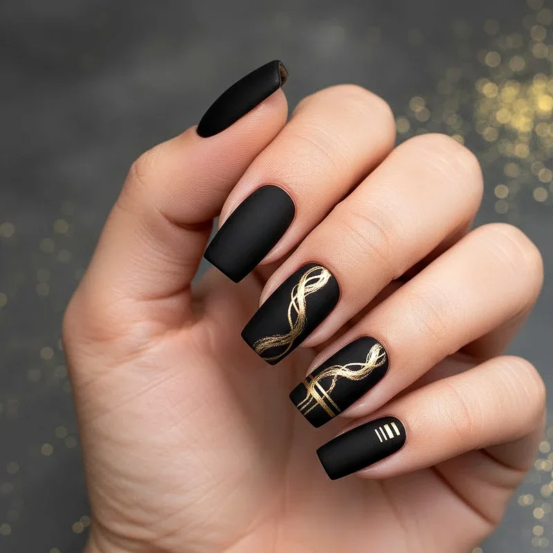 Matte black nails featuring strategic gold accents embody the ultimate baddie energy with sophisticated edge. The flat black base creates a mysterious foundation while gold details add just enough sparkle. You can incorporate gold through foil, striping tape, geometric patterns, or delicate chain designs. This combination works across all nail shapes, from square to almond. The contrast between matte and metallic finishes creates visual interest that keeps people looking twice. Gold accents can be minimal for understated elegance or bold for maximum drama. This design transitions seamlessly from day to night, making it incredibly versatile. Matte black with gold proves that classic combinations create the fiercest statements in nail fashion today.