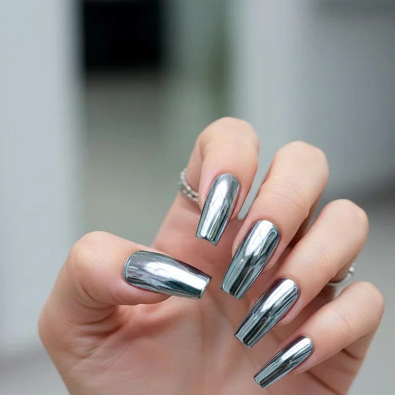 Long coffin nails paired with a chrome finish create an instantly recognizable baddie aesthetic that turns heads wherever you go. This shape elongates your fingers while the metallic sheen catches light from every angle. Chrome finishes work beautifully in silver, rose gold, or holographic variations, giving you endless options. The coffin shape provides enough canvas for the chrome to really shine. You can rock this look for special occasions or make it your everyday signature style. The reflective quality adds dimension that flat colors can't achieve. Maintenance is surprisingly manageable since chrome finishes hide minor wear better than traditional polishes. This combination screams luxury and confidence, perfect for embracing your inner baddie.