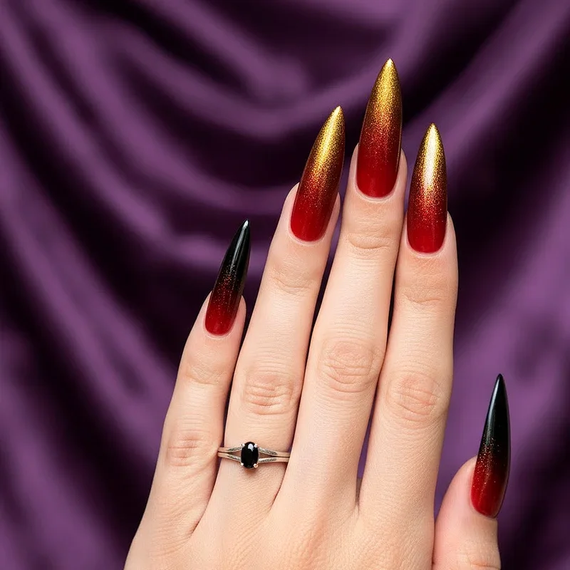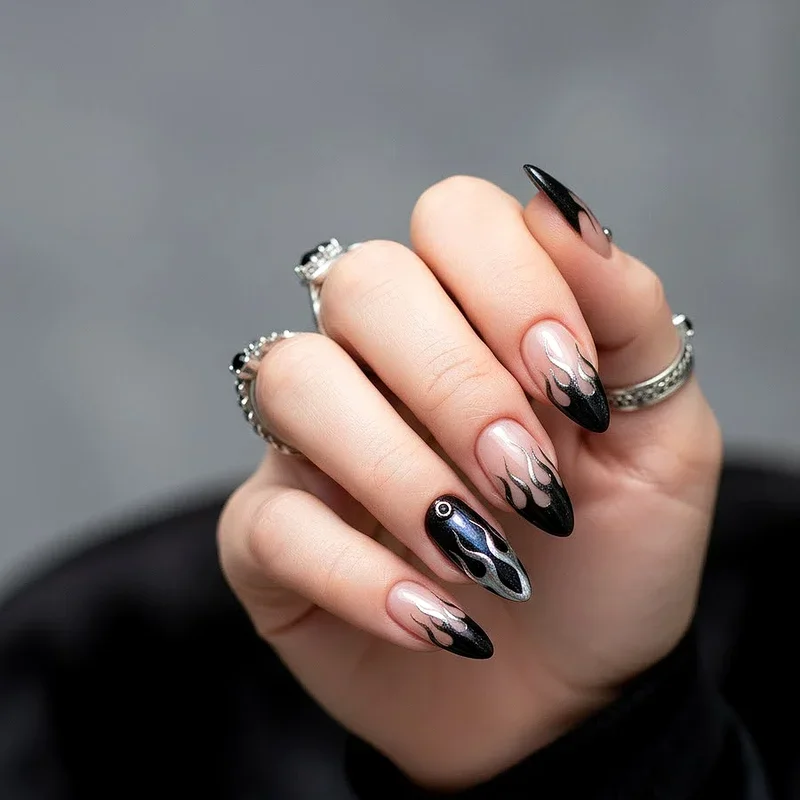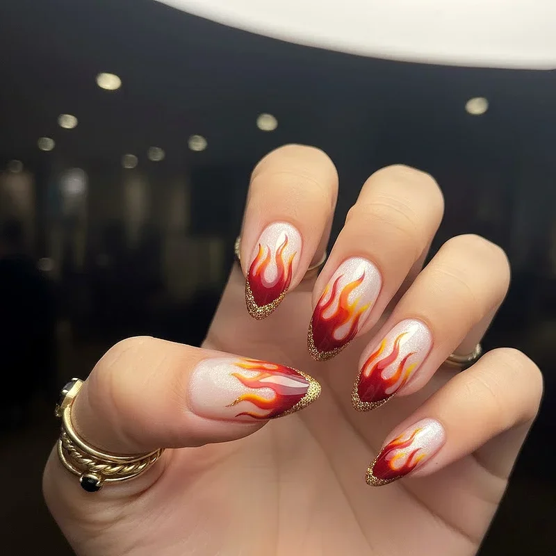 Flame design nails ignite fierce energy with their dynamic, movement-suggesting patterns that dance across your fingertips. These designs typically feature gradient color transitions from deep reds to bright oranges and yellows. The upward-reaching flame shapes create visual elongation, making fingers appear longer and more elegant. You can keep flames realistic or stylize them with unexpected colors like blue or purple. Flame nails work exceptionally well on longer nail lengths where patterns have room to develop. This bold design makes definitive statements about your fearless personality and willingness to embrace attention. The symmetrical yet organic nature provides structure while maintaining artistic freedom. Flame nails channel pure baddie confidence, announcing your presence before you speak.