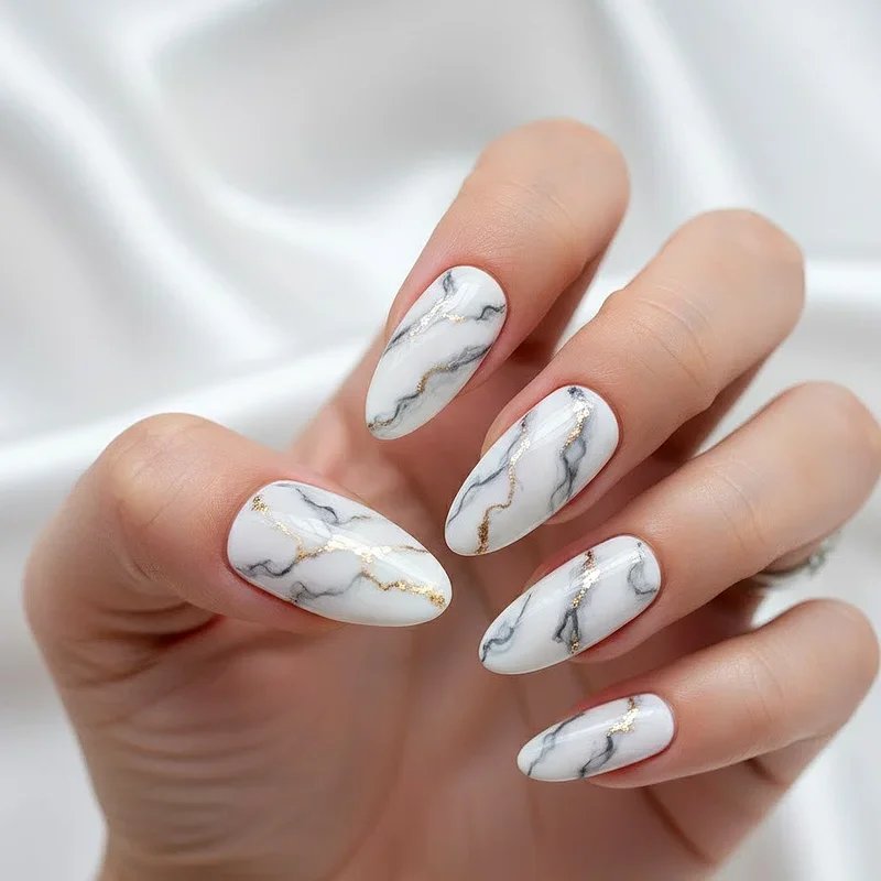 Almond-shaped nails featuring marble designs combine natural elegance with artistic flair for a sophisticated baddie aesthetic. The tapered shape flatters most hand types while providing a perfect canvas for swirling marble patterns. Marble designs can incorporate classic white and gray or experiment with colorful variations like pink or blue. This style feels luxurious and high-end, resembling actual marble countertops on your fingertips. The organic nature means each nail becomes a unique piece of wearable art. You can achieve this look with water marbling, stamping, or hand-painting techniques. The almond shape keeps the design refined rather than overwhelming. Marble nails work year-round and complement virtually any outfit in your wardrobe effortlessly.