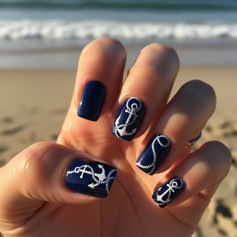 Set sail with classic nautical elements that never go out of style. Alternate between navy blue, white, and red stripes on different nails for that maritime flag effect. Paint delicate gold or silver anchors as focal points on accent nails. Add rope details by creating twisted line patterns with a thin brush. Small ship wheels, lighthouses, or sailor knots enhance the seafaring theme. This preppy design works beautifully for yacht parties, beach clubs, or casual seaside strolls. The crisp color combination keeps things sophisticated while maintaining playful beach vibes. Consider adding tiny rhinestones as "port lights" for evening glamour. These nails prove that beach style can be both classic and contemporary.