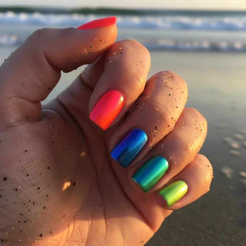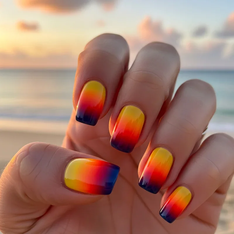 Who doesn't love watching the sun dip below the horizon at the beach? Capture that magical moment on your nails with a stunning sunset gradient. Begin with a bright yellow at the cuticle, blending into vibrant orange, then deep pink, and finally purple at the tips. Use a makeup sponge for seamless color transitions that mirror nature's artistry. Add silhouettes of palm trees or birds for extra tropical flair. This design transforms your nails into mini masterpieces celebrating those golden hour moments. The warm color palette complements sun-kissed skin beautifully, making it perfect for beach vacations or summer festivities. Each glance at your nails will remind you of those breathtaking beach sunsets.