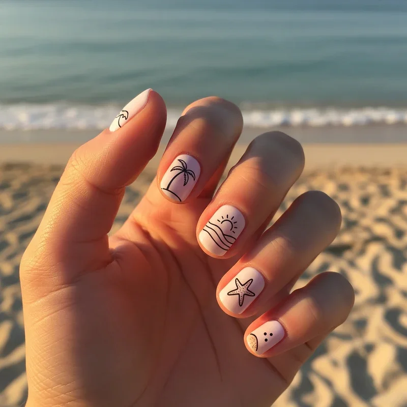 Embrace simplicity with elegant line art capturing beach essence in minimal strokes. Use thin black or navy lines to create simple waves, palm fronds, or sun designs on nude or white bases. Single continuous lines forming seashells or starfish offer modern sophistication. This understated approach suits those preferring subtle beach references. The clean aesthetic works in professional environments while maintaining vacation vibes. Add single dots of gold or blue for small color accents. These nails prove less can be more in nail art. Perfect for minimalism lovers who still want beach inspiration. The simple designs are easy to recreate at home while looking professionally done.