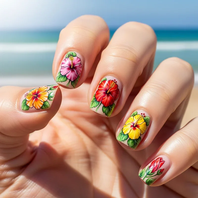 Nothing says tropical paradise quite like blooming hibiscus flowers adorning your nails. Paint vibrant pink, red, or orange hibiscus blooms with yellow centers on a white or turquoise base. Use a dotting tool for the flower center and thin brush strokes for delicate petals. Add green leaves for contrast and authenticity. Some prefer one large flower per accent nail, while others scatter smaller blooms across multiple fingers. The bold colors instantly elevate any beach outfit and photograph beautifully against ocean backgrounds. This Hawaiian-inspired design brings island culture to your fingertips. Seal with glossy topcoat to make colors pop like real tropical flowers. Every gesture becomes a celebration of paradise with these stunning floral nails.