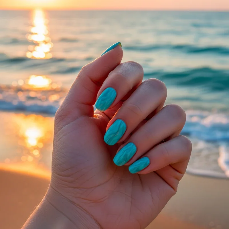 Create mesmerizing patterns that mimic Caribbean waters with the marble technique. Drop turquoise, teal, white, and light blue polishes into water, creating concentric circles. Use a toothpick to swirl colors into organic patterns before dipping nails. Each nail becomes unique, like different views of tropical water. The marbled effect captures movement and depth found in crystal-clear beach waters. Add gold flakes or glitter for sun-sparkle effects on the water's surface. This technique requires practice but delivers stunning results worth the effort. The abstract nature means imperfections add to the natural water-like appearance. These nails bring vacation vibes to everyday life with their dreamy, fluid patterns.