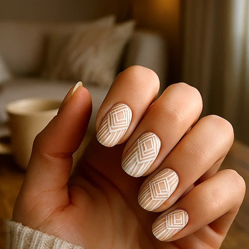 Draw inspiration from those stunning macramé wall hangings with intricate line work that creates textile-like patterns across your nails using nothing but precise brushstrokes. These designs feature interconnected knots, braids, and geometric patterns that mimic the fiber art renaissance happening in boho decor. Start with a neutral base and use fine liner brushes to create crossing lines that form diamond patterns, chevrons, or abstract knot designs. The beauty lies in the repetition and rhythm of the patterns, creating visual texture without actual dimension. Mix thick and thin lines for variety, and consider using white on nude for a subtle effect or black for bold contrast. This technique especially shines when you maintain consistency across all nails, creating a cohesive textile-inspired manicure that looks professionally crafted.