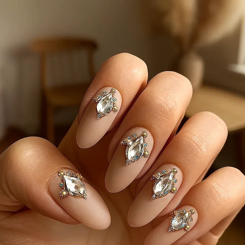 Transform your nails into a crystal healing session with gemstone embellishments that bring three-dimensional magic and metaphysical energy to your manicure. This style goes beyond flat nail art by incorporating actual tiny crystals, rhinestones, or crushed minerals that catch light and create texture. Start with a base color that complements your chosen stones; deep purples for amethyst vibes, soft pinks for rose quartz energy, or black for that protective obsidian feeling. Strategically place crystals using nail glue or gel polish, creating clusters that mimic natural crystal formations or scattered patterns that suggest crystal caves. Mix different sizes and shapes for organic appeal, and consider combining flat-back rhinestones with crushed glass or holographic elements for maximum sparkle. This design works best as accent nails since too many embellishments can catch on clothing.