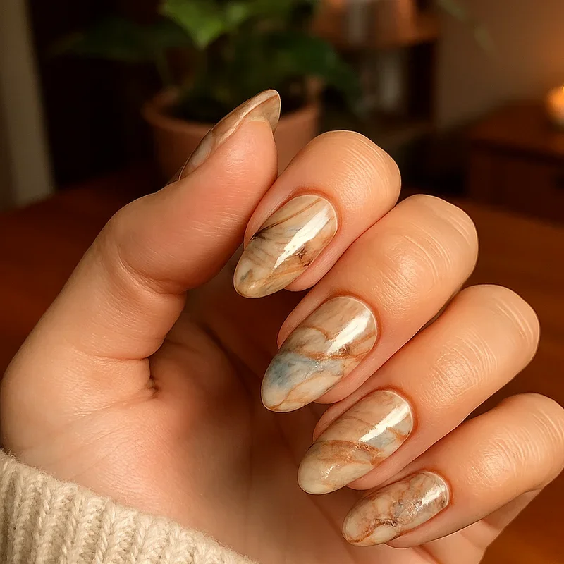 Channel the raw beauty of turquoise, jade, and agate with natural stone marble effects that turn your nails into precious gems worth showing off. This technique involves swirling complementary colors together while the polish is still wet, creating those organic veining patterns found in genuine stones. Water marbling or using a thin brush to drag colors through each other achieves these geological wonders on your fingertips. Focus on color combinations that mirror real stones; turquoise with black veining, rose quartz with white wisps, or deep green malachite patterns. The unpredictability of this technique means each nail becomes unique, just like stones formed over millennia in nature. Seal everything with a high-gloss topcoat to achieve that polished stone effect that catches light and draws compliments wherever your hands wander.