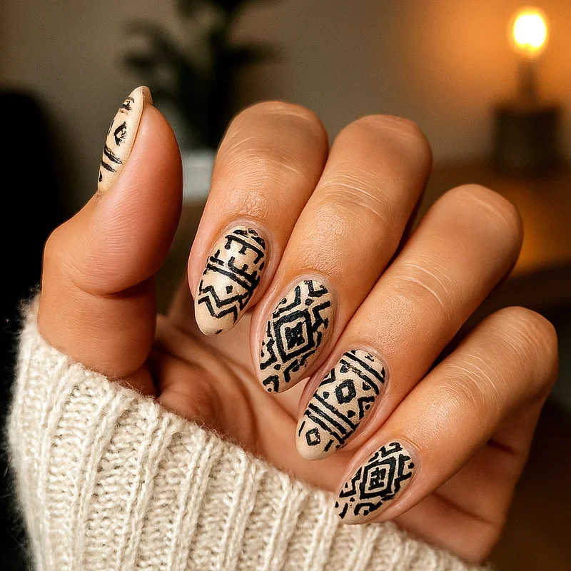 Make a bold declaration with tribal patterns that honor indigenous artistry while adding serious visual impact to your nail game. These designs feature strong geometric shapes, repetitive patterns, and high contrast color combinations that demand attention and respect. Think Aztec-inspired triangles, African mud cloth patterns, or Polynesian tattoo motifs scaled down to nail-sized canvases. Use tape or stencils to achieve those sharp, clean lines that make tribal patterns so striking, alternating between filled shapes and negative space for dynamic visual interest. Color palettes typically stay earthy with blacks, whites, browns, and ochres, though modern interpretations might incorporate unexpected pops of coral or turquoise. Remember that these patterns carry cultural significance, so approach them with appreciation and respect for their origins while creating your own interpretations.