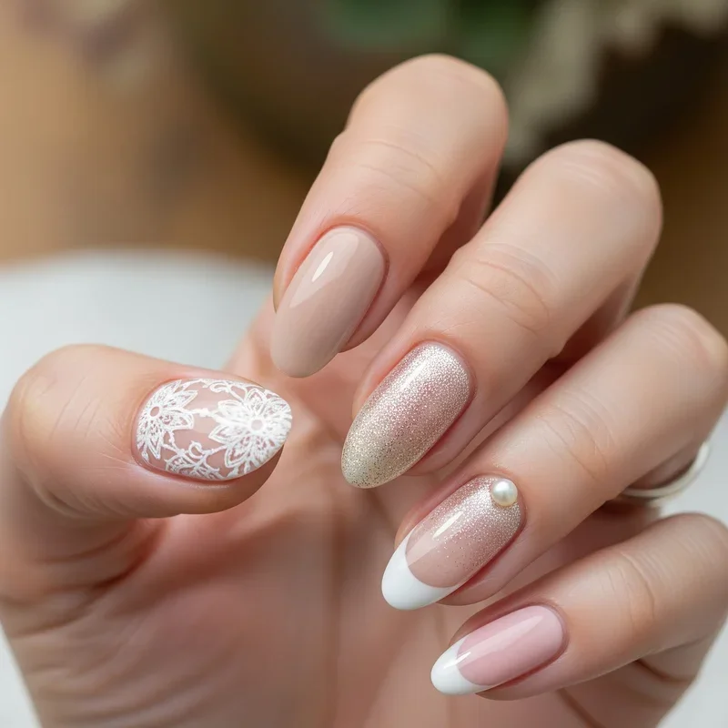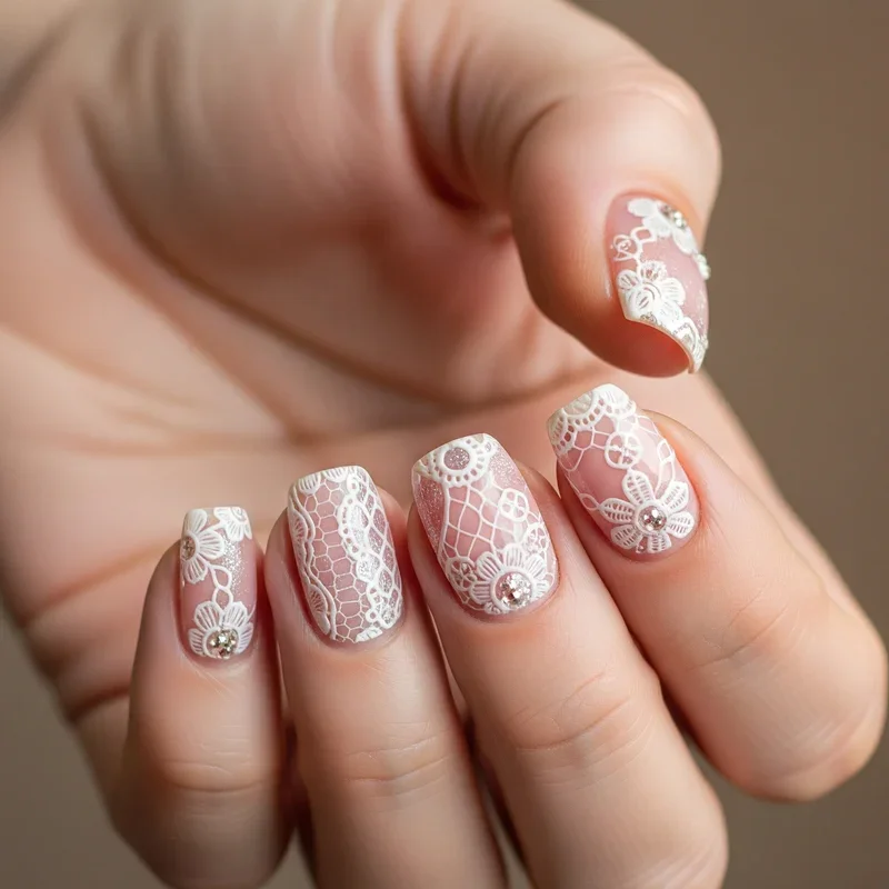 Channel old-world romance with vintage lace-inspired nail designs that add intricate beauty to your bridesmaids' manicures while celebrating timeless elegance. These delicate patterns, whether hand-painted or applied as decals, create the illusion of wearing tiny lace gloves on each fingertip, adding Victorian charm to modern celebrations. The intricate details work best over nude or soft white base colors, allowing the lace patterns to stand out while maintaining sophistication and wedding-appropriate style. Your bridesmaids will feel connected to timeless bridal traditions while sporting a unique, artistic manicure that photographs beautifully and adds character to detail shots. This design particularly suits vintage-themed weddings or ceremonies in historic venues where every detail celebrates classic elegance and romantic nostalgia. The lace patterns can range from simple doily-inspired designs to elaborate Victorian motifs, depending on your wedding's formality level and personal preference. These nails create stunning detail shots when photographed alongside lace wedding elements, tying together your vintage theme perfectly.