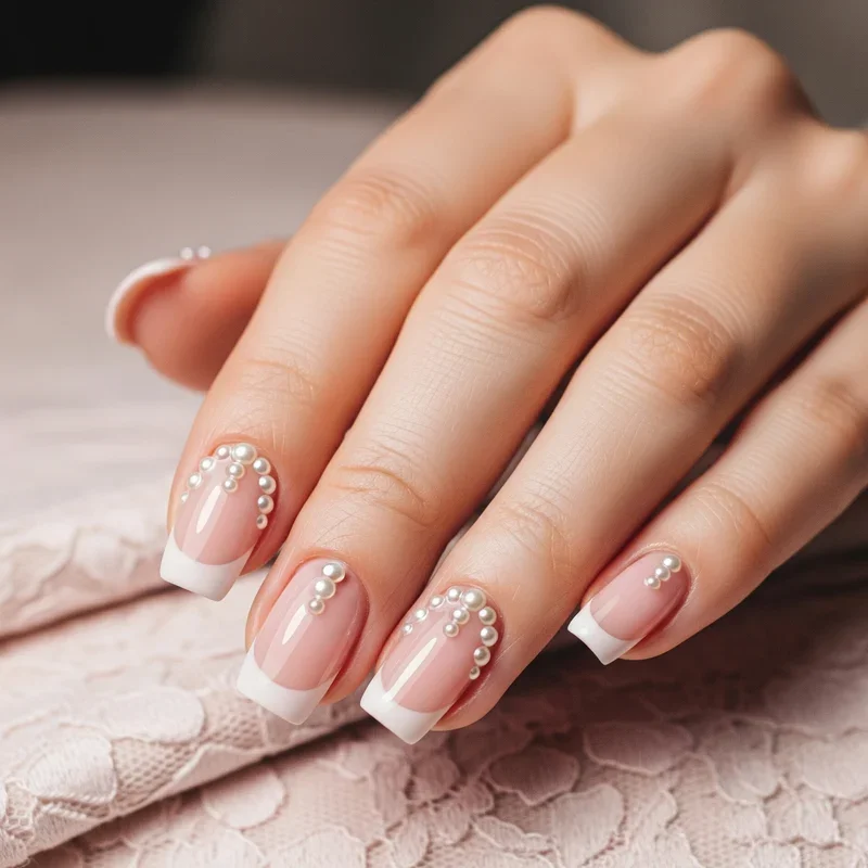 Transform your bridesmaids' nails into miniature works of art with delicate pearl embellishments that scream luxury and refinement while maintaining wedding-appropriate elegance. These tiny pearls, strategically placed on accent nails or creating subtle patterns, add dimension and interest without overwhelming the overall look or appearing too busy in photographs. The combination of nude or soft pink base colors with pearl accents creates an expensive, high-end appearance that photographs beautifully from every angle. Your bridesmaids will feel like they're wearing fine jewelry on their fingertips, perfectly complementing their wedding day accessories and adding to their overall glamour. This design works especially well for formal or black-tie weddings where every detail needs to exude elegance and sophistication. The pearls can be arranged in various patterns, from single statement pieces to delicate clusters that mimic vintage jewelry designs you've always admired. Just imagine how stunning these will look holding bouquets and creating those perfect detail shots!