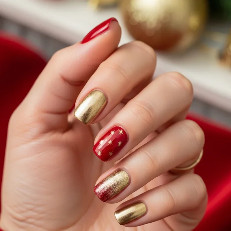 Nothing says Christmas quite like the timeless combination of red and gold! This classic duo brings instant holiday elegance to your fingertips. Start with a rich, cherry red base coat that screams festive cheer, then add golden accents like stripes, dots, or geometric patterns. You can alternate between solid red nails and gold glitter accent nails for a balanced look. The beauty of this design lies in its versatility; it works perfectly for both formal Christmas dinners and casual cookie exchanges. Consider adding tiny gold stars or delicate swirls to elevate the design. This combination complements any outfit and captures the warmth and luxury of the season beautifully. The psychological impact of these colors is powerful too - red evokes passion, warmth, and excitement, while gold represents prosperity and celebration. Together, they create a manicure that feels both traditional and luxurious. For added dimension, try incorporating different textures like matte red with glossy gold accents, or use gold foil for an ultra-glamorous effect that catches the light beautifully.