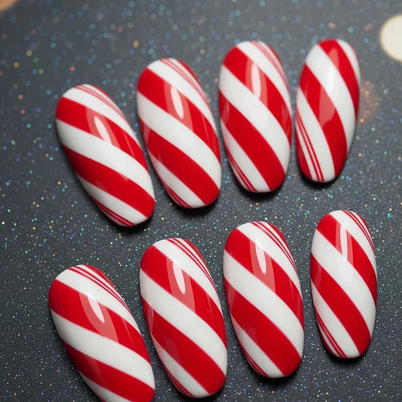 Who doesn't love the sweet nostalgia of candy canes during Christmas? Transform your nails into miniature peppermint treats with this playful design! Begin with a crisp white base coat, then carefully paint diagonal red stripes across each nail. The key is maintaining consistent spacing between stripes for that authentic candy cane look. You might alternate the stripe direction on each finger for added visual interest. This design works wonderfully on both short and long nails, making it universally flattering. For extra pizzazz, add a glossy topcoat that mimics the shiny surface of real candy canes. It's a design that brings smiles and starts conversations at every holiday gathering! The technique for creating perfect stripes involves using nail tape or thin brushes, and patience is your best friend here. Some nail artists recommend practicing the stripe pattern on paper first to get comfortable with the motion. You can also experiment with different stripe widths - thin pinstripes for a delicate look or bold stripes for more impact. The candy cane design pairs beautifully with solid red or white nails if you prefer to feature it as an accent.