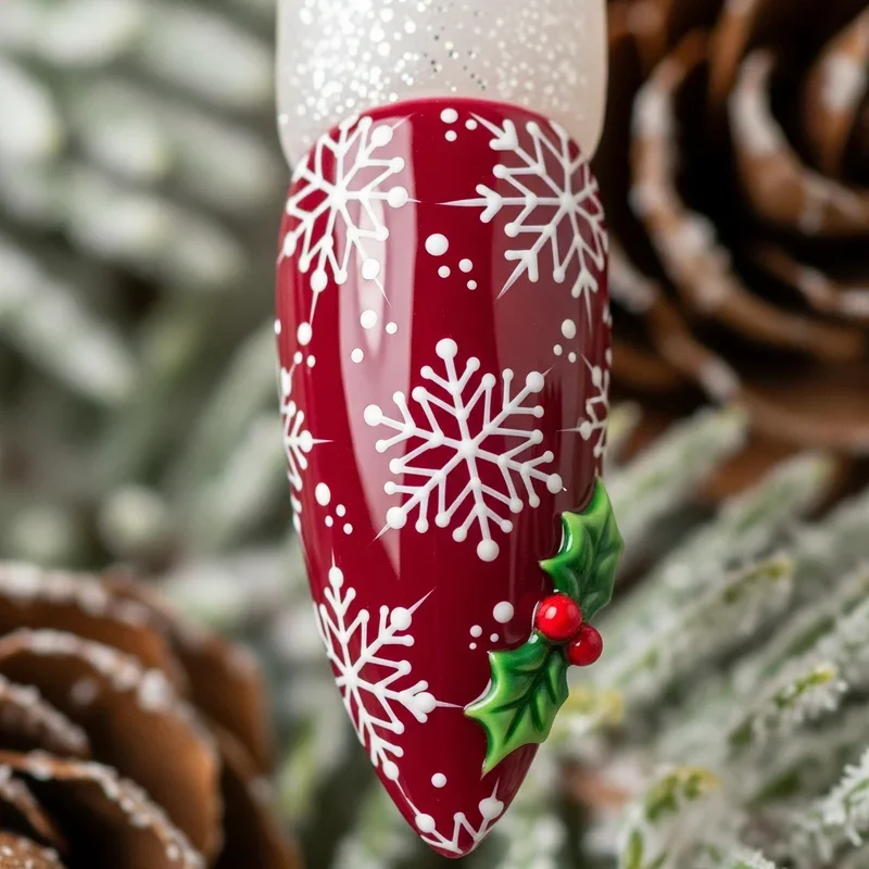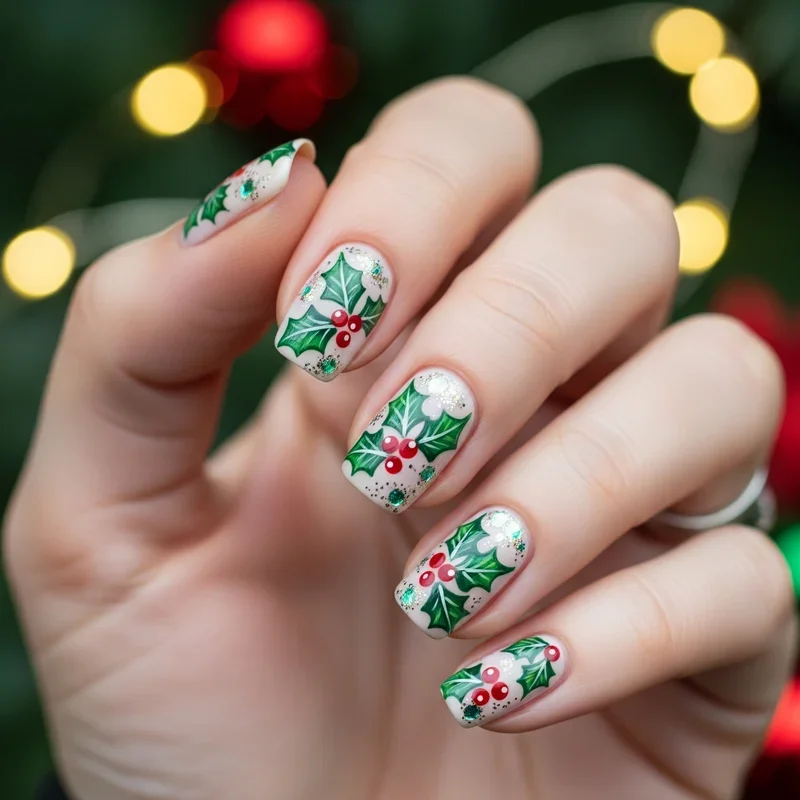 Celebrate nature's Christmas decorations with festive holly berry nail art! Paint delicate holly leaves in deep green with defined edges and veining for realism. Add clusters of bright red berries using dotting tools for perfect circles. The design works beautifully as an accent on one or two nails paired with solid red or green companions. Gold outlining adds elegance and makes the design pop. This timeless motif symbolizes holiday tradition and natural beauty. Consider varying the holly placement on each nail for an organic, scattered effect. The combination of green leaves and red berries creates perfect color balance while maintaining that unmistakable Christmas feel throughout the design! To create realistic holly leaves, start with a base green color, then add darker green for shadows and lighter green for highlights. Use a thin brush to create the characteristic spiky edges of holly leaves. The berries should be placed in clusters of two or three, with tiny white dots added for shine. You can also incorporate gold veining in the leaves for an elevated, luxurious look. This classic design never goes out of style and appeals to those who appreciate traditional Christmas imagery.