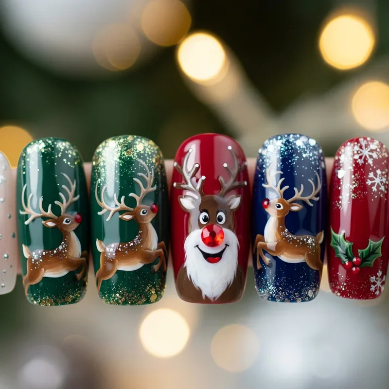 Bring Santa's trusty companions to your nails with adorable reindeer designs! Focus on Rudolf with his bright red nose on accent nails, while other fingers feature his fellow reindeer friends. Use brown polish for faces, adding details like antlers, eyes, and noses with fine brushes. The design can range from realistic to cartoon-style depending on your preference and skill level. Pair reindeer faces with simple brown or red nails for cohesion. Add small snowflakes or stars around them for extra festive flair. This whimsical design appeals to all ages and brings storytelling magic to your manicure. It's perfect for family gatherings where children will delight in your creative nail art! Creating convincing reindeer requires planning the face layout first. Start with an oval brown base, add triangular ears, then work on the antlers using a thin brush. Eyes can be simple dots or more detailed with white highlights for expression. Don't forget Rudolf's signature red nose! For a modern twist, try minimalist reindeer silhouettes against a snowy background. You can also include other Arctic animals like polar bears or penguins for variety. This design encourages creativity and personal interpretation.