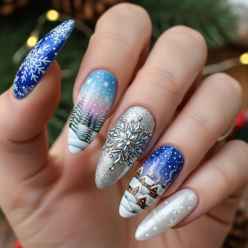 Capture the magic of a snowy Christmas morning right on your fingertips! This enchanting design features delicate snowflakes dancing across a wintry backdrop. Choose a base color like icy blue, soft gray, or classic white, then add intricate snowflake patterns using fine nail art brushes or stamps. Each nail can showcase a different snowflake design, celebrating the uniqueness of real snow crystals. Silver or white glitter adds dimension and mimics the sparkle of fresh snow. This design feels sophisticated yet whimsical, perfect for those who prefer subtle holiday nail art. The snowflake theme transcends religious boundaries, making it ideal for inclusive holiday celebrations while still feeling distinctly festive. Creating realistic snowflakes requires attention to detail - remember that snowflakes have six points and intricate crystalline patterns. You can use dotting tools to create the center of each snowflake, then draw lines outward, adding smaller branches for complexity. For those less confident in freehand drawing, snowflake stickers or stamps provide professional-looking results. Consider adding a subtle gradient background that transitions from light blue to white, creating the illusion of a winter sky.