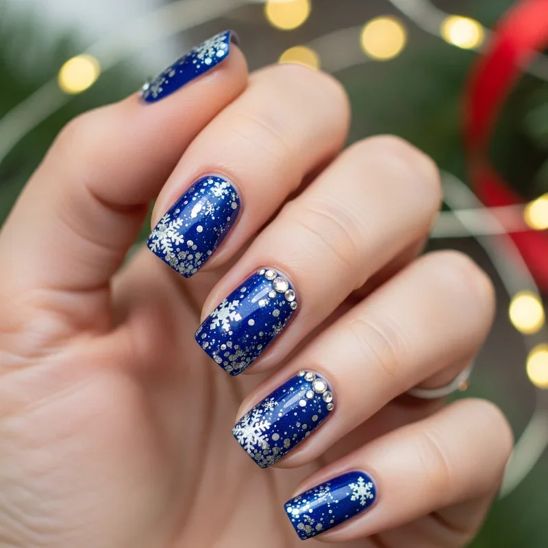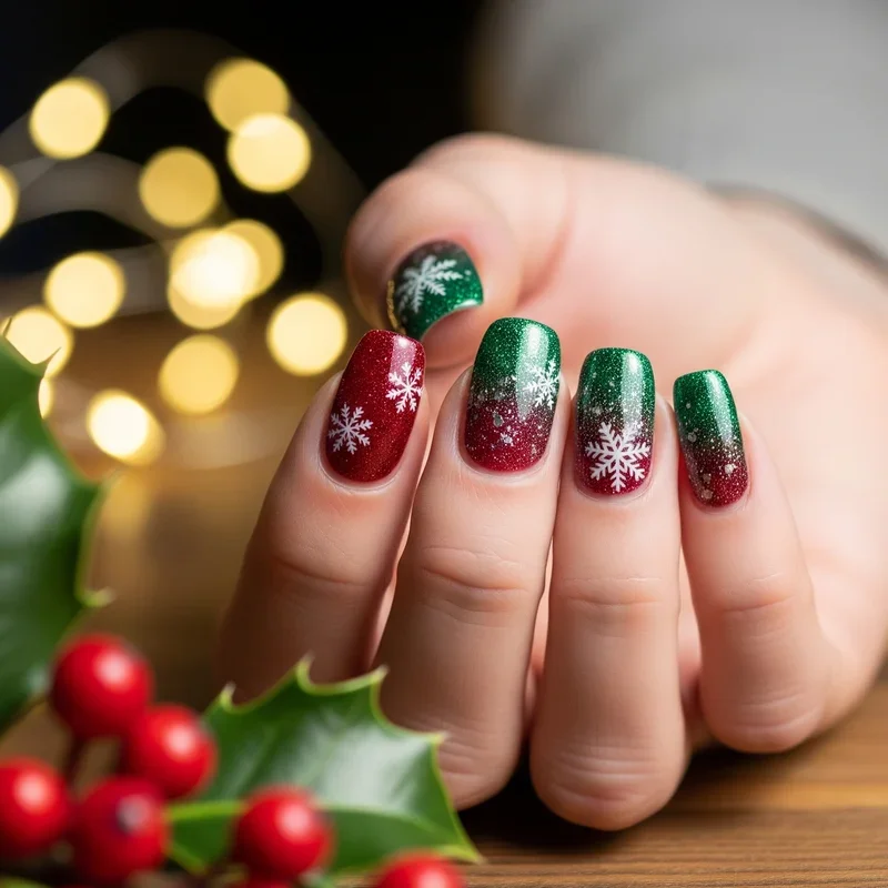 Create stunning color transitions that capture the essence of Christmas with this gradient technique! Blend traditional holiday colors like red to green, gold to red, or white to silver for magical effects. The smooth color transition requires sponging techniques but delivers professional-looking results. Add glitter to the tips for extra sparkle or keep it simple for elegant sophistication. This design works on any nail length and shape, making it universally flattering. The gradient effect feels modern and artistic while maintaining festive appeal. Consider using three colors for more complex gradients that truly showcase your nail art skills. It's a design that proves Christmas nails can be both trendy and traditional! The sponging technique involves applying polish stripes to a makeup sponge, then dabbing onto the nail in a rolling motion. Multiple thin layers create smoother transitions than one thick application. Clean up around the cuticles is essential for a professional finish. Experiment with vertical, horizontal, or diagonal gradients for different effects. Adding a glitter gradient over the color gradient creates incredible depth and dimension. This versatile design can be subtle with similar tones or bold with contrasting Christmas colors.