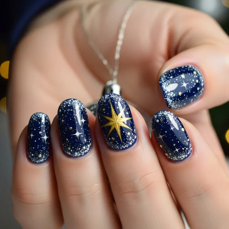 Capture the magic of Christmas Eve with this celestial design featuring a midnight blue base adorned with twinkling stars! Use a deep, rich blue polish as your canvas, then add various sized stars in silver, gold, and white. Create depth by using different techniques like stamps, stickers, and hand-painted designs. Include one statement nail featuring a large Bethlehem star for religious significance. Subtle shimmer in the base coat adds to the nighttime effect. This design feels both spiritual and stylish, perfect for Christmas Eve services or elegant holiday parties. The dark base makes metallic elements truly shine, creating a sophisticated look that sparkles like the night sky! To achieve a realistic night sky effect, blend different shades of blue and purple in the base. Use a makeup sponge to create subtle color variations that mimic the actual night sky. Stars can be created using a small brush with five points, or you can use star-shaped studs for precision. Adding tiny dots around larger stars creates a constellation effect. This design allows for personal interpretation - some might add a subtle moon, while others focus purely on stellar elements.