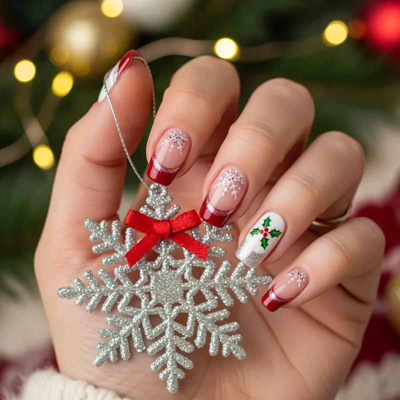 Give the classic French manicure a holiday makeover that's both elegant and fun! Instead of traditional white tips, opt for festive colors like deep red, emerald green, or shimmering gold. You can even alternate colors on different nails for a playful effect. Add thin metallic stripes where the tip meets the nail bed for extra glamour. Some variations include adding tiny Christmas motifs like stars or trees to one accent nail. This design maintains the sophistication of a French manicure while embracing holiday spirit. It's perfect for professional settings where you want to be festive without going overboard. The result? Nails that whisper "holiday chic" rather than shout it! The technique for creating perfect festive French tips involves using guides or freehand skills with a steady hand. Consider using gel polish for longer-lasting results and sharper lines. You can also experiment with different tip shapes - traditional curved, straight across, or even pointed for a modern twist. Adding glitter to just the tips creates a subtle sparkle that's office-appropriate yet festive. This design proves that classic techniques can be reinvented for any season while maintaining their timeless appeal.