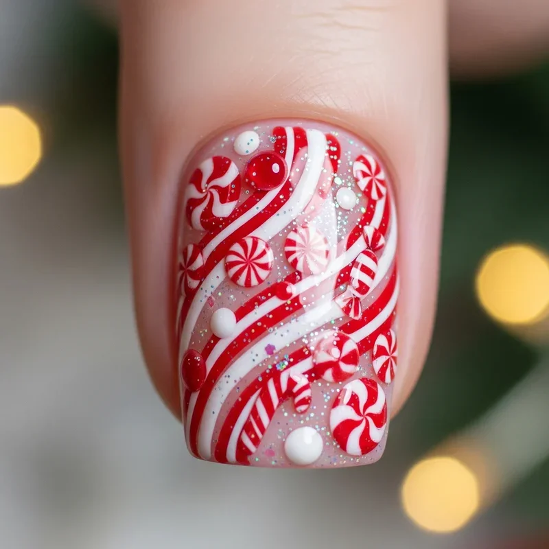 Indulge your sweet tooth with nails inspired by peppermint candies! Create mesmerizing swirls of red and white that spiral from the center of each nail outward. The technique requires patience but delivers stunning results that look good enough to eat. Use a toothpick or thin brush to blend colors while wet for authentic swirl effects. Alternate between peppermint swirls and solid red or white nails for balance. A glossy topcoat enhances the candy-like appearance. This design brings childhood memories of Christmas treats to life on your fingertips. It's playful yet polished, making it suitable for various holiday occasions while maintaining that sweet festive charm! The swirl technique involves placing drops of red and white polish close together on the nail, then using a toothpick to create the spiral pattern by dragging from the center outward. Work quickly while the polish is still wet for best results. Some nail artists recommend using a base of white and adding red swirls on top for easier manipulation. The key is creating smooth, continuous curves that mimic real peppermint candy. This design pairs wonderfully with candy-themed jewelry or accessories for a coordinated holiday look.