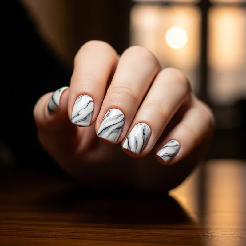 Marble nails might look complicated, but they're surprisingly achievable and absolutely stunning on short nails! This luxurious design mimics the natural veining of marble stone, creating an elegant, sophisticated look that works for any occasion. The water marble technique involves swirling different polish colors in water and dipping your nail through, while the dry marble method uses a thin brush to create veins directly on the nail. White and gray create classic marble, but you can experiment with rose gold veins on pink for a modern twist. The organic, flowing patterns of marble actually complement the natural curve of short nails beautifully, making each finger look like a tiny piece of precious stone artwork.