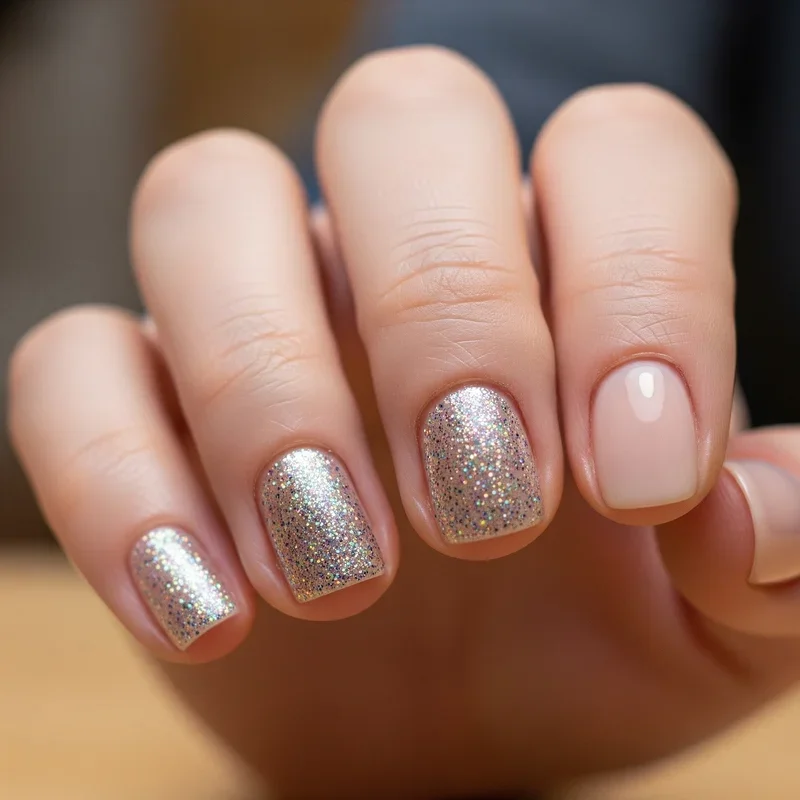 Sometimes all you need is a little sparkle to make your day brighter! Glitter accent nails are the perfect way to add glamour without going full disco ball. The strategy here is choosing one or two nails per hand to coat in glitter while keeping the others in a complementary solid shade. Your ring fingers are classic choices for accent nails, but mixing it up with your thumb or pinky keeps things interesting. You can go for chunky glitter for maximum impact, fine shimmer for subtle elegance, or holographic glitter that changes color in different lights. The best part about glitter on short nails? It catches the light beautifully without needing much surface area to make a statement.