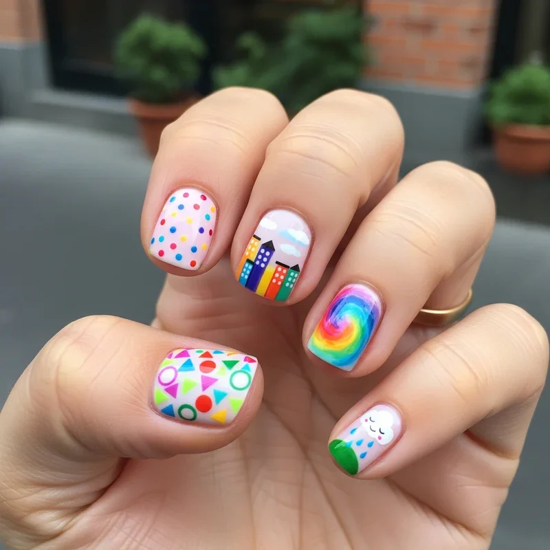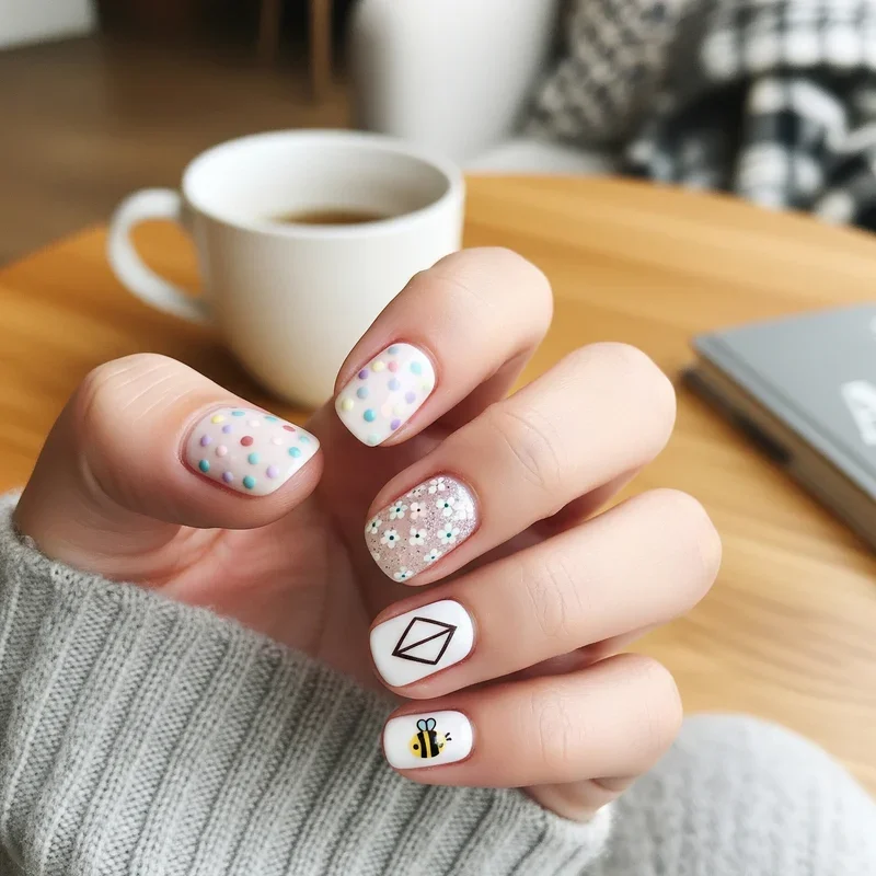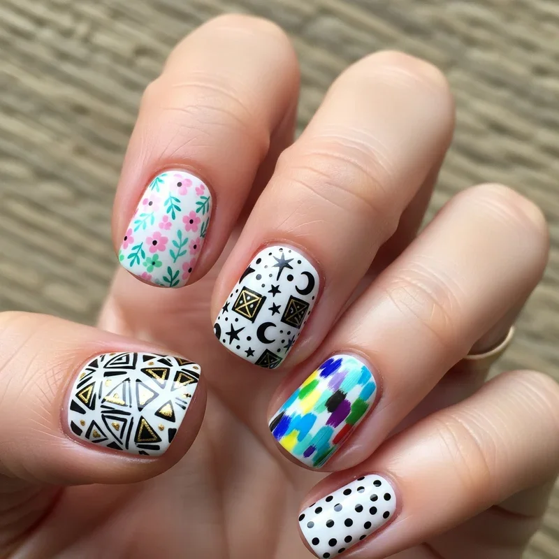 Why settle for one design when you can have them all? Mix and match manicures let you combine different patterns and colors across your ten fingers for a playful, eclectic look that's totally unique to you! You might pair stripes with polka dots, florals with geometric shapes, or solid colors with glitter accents. The trick is maintaining some common element like a color palette or theme to tie everything together. This trend celebrates individuality and creativity while being perfect for short nails since each nail becomes its own little artwork. You could dedicate each nail to a different pattern or alternate between two complementary designs. It's the perfect solution for those who can never decide on just one look!