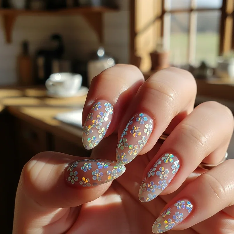 Step into the future with holographic flower accents that shift and shimmer with every movement, creating an otherworldly botanical experience. This modern technique combines traditional floral designs with cutting-edge nail technology. Apply a neutral or black base to make the holographic elements truly pop. Create flower outlines using regular polish, then fill them with holographic powder or polish that reflects rainbow colors. The prismatic effect makes flowers appear to change color as you move your hands, creating constant visual interest. Add holographic glitter to flower centers or use chrome powder on select petals for extra dimension. Balance the futuristic elements with traditional green leaves to ground the design. This show-stopping style perfect for festivals, parties, or anyone who loves to push nail art boundaries into new territories.