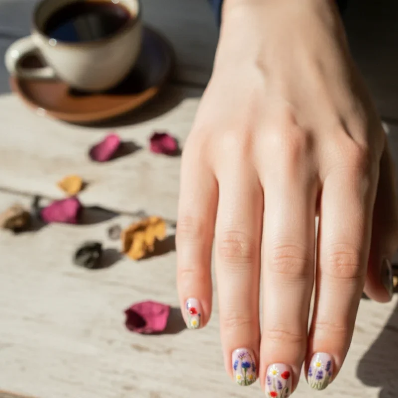 Celebrate nature's diversity with a wildflower meadow design that combines multiple flower types in one harmonious composition. This free-spirited approach captures the natural beauty of an untamed garden. Paint each nail with a soft green or sky blue base to represent grass and sky. Add various wildflowers including poppies, cornflowers, daisies, and buttercups in different sizes and heights. Use a variety of colors but maintain harmony by keeping them within a similar saturation level. Scatter the flowers naturally rather than placing them symmetrically, mimicking how wildflowers grow in nature. Include thin grass blades and tiny flying seeds for added realism and movement. This design tells a story of summer walks through countryside meadows, bringing that carefree feeling to your everyday life.