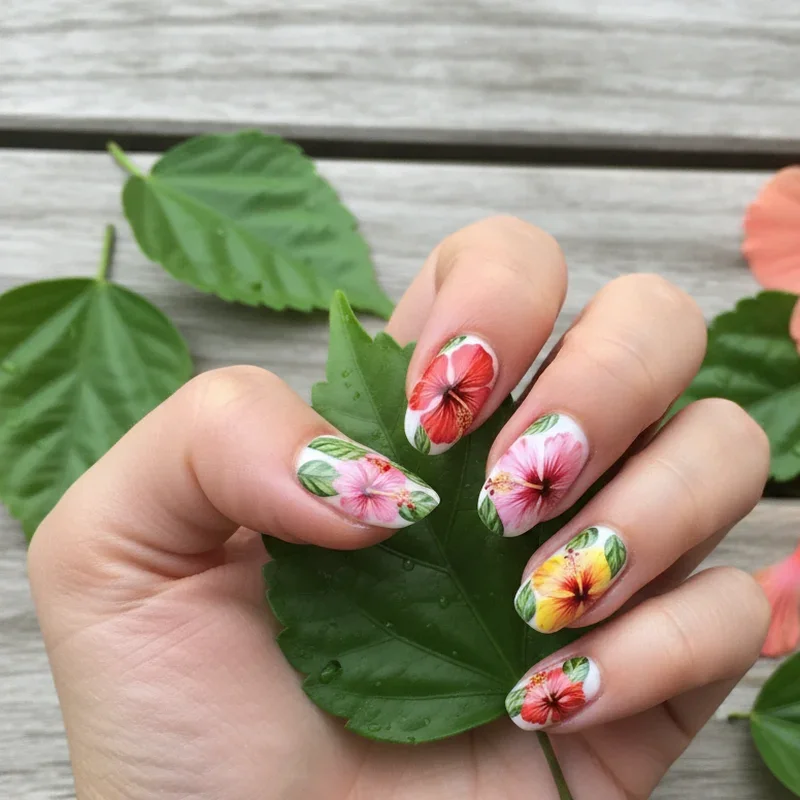 Transport yourself to a Hawaiian beach with vibrant hibiscus flowers that radiate warmth and tropical energy. These bold blooms make perfect summer nails that complement sundresses and beach vacations beautifully. Begin with a bright base color like turquoise, coral, or sunset orange to set the tropical mood. Paint large hibiscus flowers using contrasting colors; think hot pink flowers on turquoise or yellow blooms on coral backgrounds. Each petal should be clearly defined with slightly darker edges for dimension. Add the characteristic long stamen extending from the center using a contrasting color. Include tropical leaves in various shades of green to complete the paradise vibe. This design works best on medium to long nails where the flowers have room to bloom in their full glory.