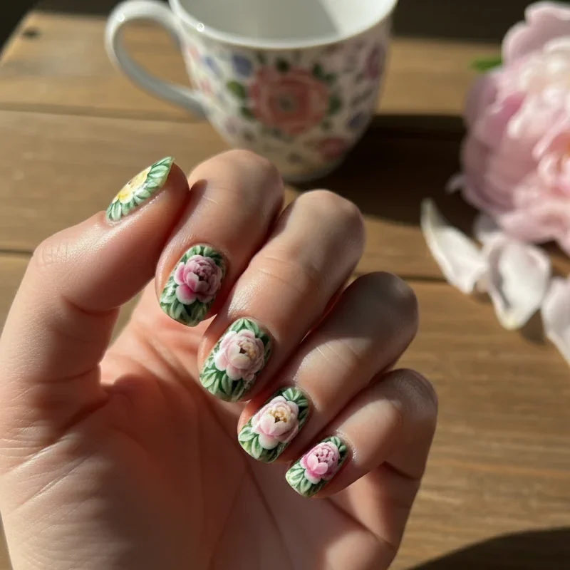 Indulge in the luxurious beauty of peonies with soft pastel shades that create a romantic garden party atmosphere on your nails. These lush, full blooms epitomize feminine elegance and springtime grace. Begin with a barely-there pink or peach base that complements the pastel palette. Paint large, layered peony blooms using multiple shades of the same color family to create depth and dimension. Each layer should be slightly visible beneath the next, creating that characteristic full, ruffled appearance peonies are known for. Add sage green leaves as accents without overwhelming the delicate flowers. Use a matte top coat on some nails and glossy on others to create textural interest that mimics how light plays on real peony petals. This design perfect for bridal showers, garden parties, or whenever you want to feel especially feminine.