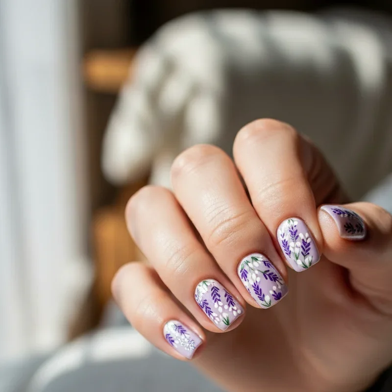 Capture the serene beauty of Provence lavender fields with this calming and aromatic-inspired nail art that soothes the soul. This design brings the peaceful essence of purple meadows right to your fingertips. Start with a soft purple or lilac base that mimics the distant view of lavender fields. Using a thin brush, create tiny vertical stems in varying shades of green, arranging them at different heights for natural variation. Add small purple dots along each stem to represent individual lavender buds, using darker purple at the base and lighter shades toward the tips. The repetitive pattern creates a meditative quality that's both relaxing to create and beautiful to admire. This design pairs wonderfully with spring and summer outfits while maintaining enough subtlety for year-round wear.
