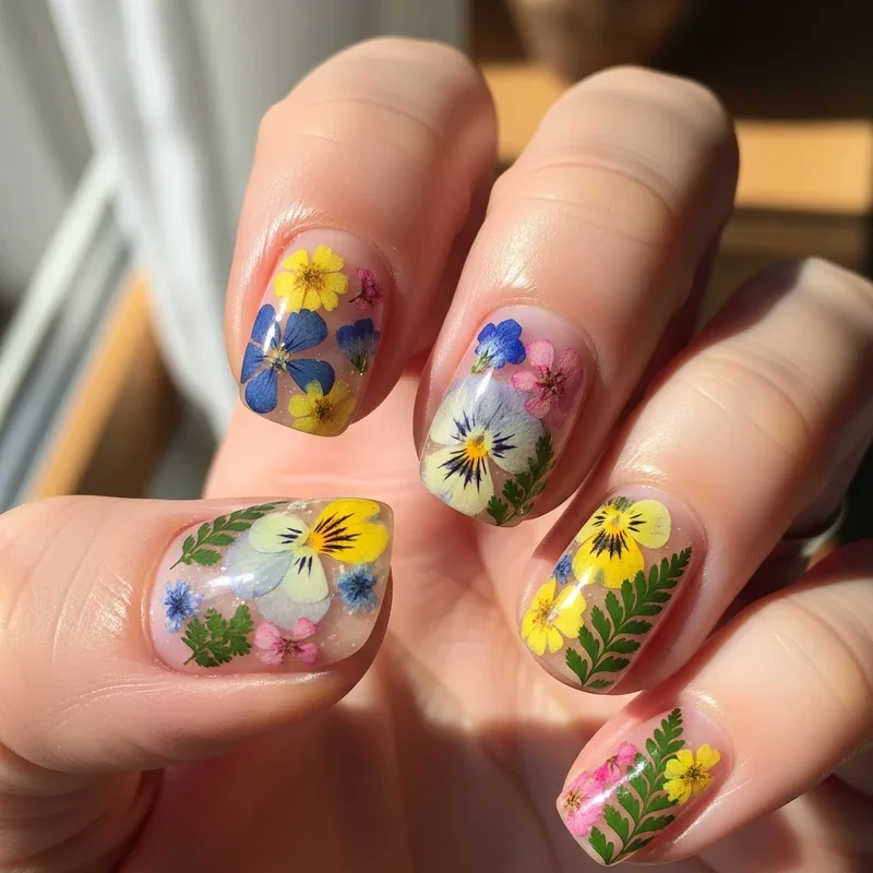 Achieve the vintage charm of pressed flowers preserved in resin without using actual botanicals on your nails. This technique creates an incredibly realistic effect that looks like you've captured real flowers under glass. Start with a nude or transparent base to mimic the look of natural preservation. Paint ultra-thin flower petals using translucent gel polishes in various shades, layering them to create depth without bulk. The trick is using multiple thin coats rather than one thick application, allowing each layer to cure properly. Add subtle vein details with an even thinner brush and slightly darker shades. Seal everything with a high-shine top coat that creates that glossy, preserved appearance. This design captures the delicate beauty of dried flowers while maintaining the durability needed for everyday wear.
