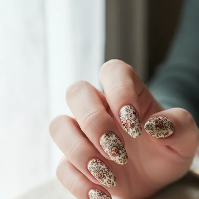 Draw inspiration from grandmother's parlor with vintage wallpaper patterns that bring nostalgic charm to modern nail art. This design combines multiple small flowers in repeating patterns reminiscent of Victorian elegance. Select a cream or pale pink base that serves as your wallpaper background. Create clusters of tiny roses, forget-me-nots, and baby's breath using muted colors like dusty rose, sage green, and soft blue. Arrange these elements in diagonal or scattered patterns across each nail, ensuring consistency while avoiding exact repetition. Add delicate gold accents or tiny pearls to certain flowers for that antique jewelry box feel. The key is achieving that slightly faded, timeworn appearance through color selection and placement that tells a story of timeless beauty.