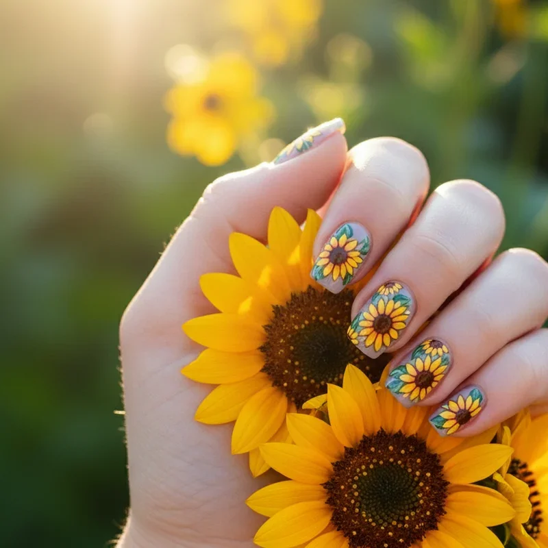 Nothing says confidence and joy quite like bold sunflower designs that turn your nails into miniature fields of golden sunshine. These cheerful blooms instantly brighten any mood and outfit with their vibrant energy. Choose a sky blue or sage green base to make your sunflowers pop against a natural backdrop. Paint large sunflower heads using bright yellow petals arranged in a circular pattern around brown centers. Create texture in the centers using a dotting tool to mimic real sunflower seeds. Add realistic touches with slightly varied petal lengths and subtle orange undertones for dimension. Include green leaves and stems to ground the design and create visual balance. These statement nails work beautifully as accent designs or can cover all nails for maximum impact during summer festivals and outdoor events.