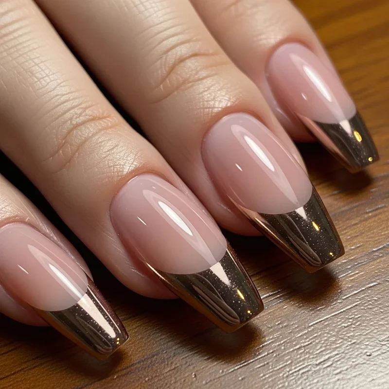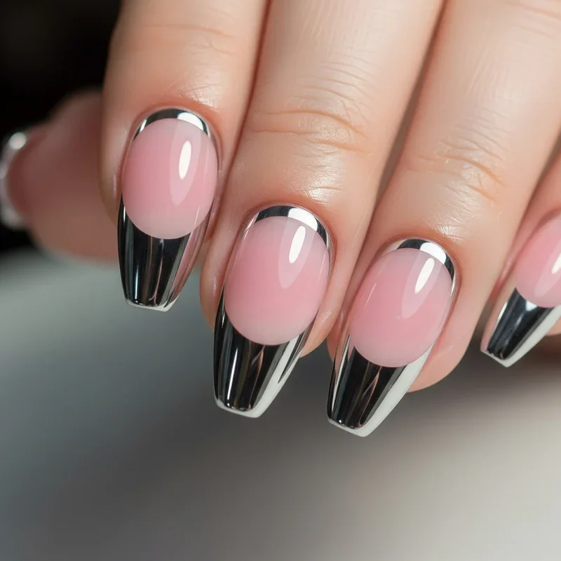 Step into the future with chrome French tips that give your nails a mirror-like finish! This ultra-modern take on the classic French manicure uses special chrome powder to create tips that literally reflect light. The metallic sheen comes in various colors like silver, rose gold, copper, and even unicorn chrome that shifts colors. The contrast between the matte or glossy base and the chrome tips creates a stunning visual effect that's impossible to ignore. This design is perfect for those who want to make a statement without going overboard with nail art. It's sophisticated yet edgy, making it suitable for both formal events and nights out. Your nails will look like they belong in a sci-fi movie!