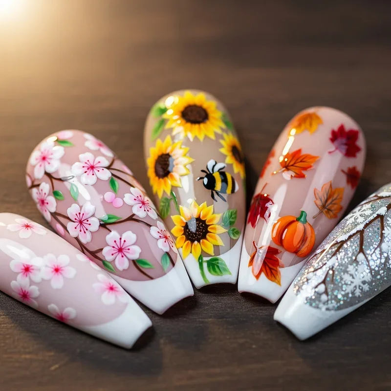 Celebrate every season with French manicures that change with the calendar! Spring calls for pastel tips with tiny flower accents, while summer demands bright corals and ocean blues. Fall French manicures can feature burnt orange, deep burgundy, or forest green tips, possibly with leaf designs. Winter brings opportunities for icy blues, silver glitter, or festive red and green combinations. You can add seasonal elements like snowflakes, pumpkins, or beach-themed decorations to make your nails truly festive. This approach keeps your manicure fresh and relevant throughout the year. It's like having a new wardrobe for your nails every few months!