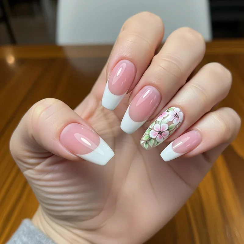 6. Floral Accent French Nails