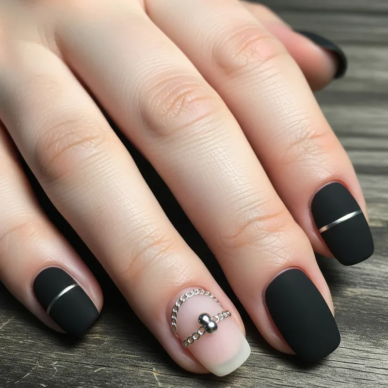 Take your gothic nails to the next dimension with actual chains, studs, and metal embellishments that add texture and edge to your manicure. These 3D elements transform your nails into miniature pieces of gothic jewelry. Start with a solid black or deep burgundy base, then carefully apply nail glue to attach tiny chains, pyramid studs, or metal crosses. The weight and texture of these elements create a punk-gothic fusion that's impossible to ignore. Strategic placement is key; too many embellishments can make daily tasks difficult. This design works best for special occasions when you want maximum impact. The combination of smooth polish and rough metal perfectly embodies the gothic aesthetic of beautiful contradiction. These industrial elements represent the modern evolution of gothic style, blending traditional darkness with contemporary edge.