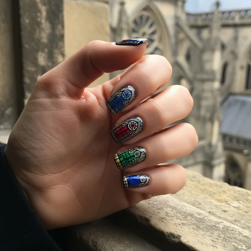 Transform your nails into miniature stained glass windows inspired by gothic cathedral architecture. This intricate design combines geometric patterns with dark colors to create an ecclesiastical effect that's both holy and haunting. Use thin black lines to create the window framework, then fill sections with deep jewel tones like burgundy, purple, and emerald. The contrast between the black leading and colored sections mimics actual stained glass beautifully. This design requires steady hands and patience but results in wearable art that's absolutely stunning. Consider adding small metallic accents to represent light filtering through the glass. Each nail becomes a tiny architectural marvel celebrating gothic design heritage. The cathedral window design connects you to centuries of gothic architecture that has inspired the aesthetic movement.
