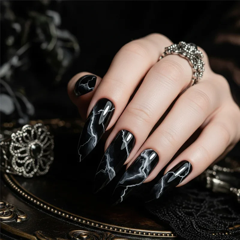 Achieve luxurious darkness with black marble nails that combine sophistication with natural gothic beauty. This technique involves swirling black, grey, and white polishes together to create organic patterns reminiscent of expensive marble stone. The water marble technique works wonderfully here, though you can also achieve similar effects with a thin brush and careful blending. Adding thin gold or silver veins elevates the design to new heights of elegance. The random nature of marble patterns means no two nails will be identical, creating a unique look that's entirely yours. This design proves that gothic style can be refined and expensive-looking while maintaining its dark essence. The marble effect suggests permanence and strength, qualities that resonate deeply with gothic philosophy about enduring beauty.