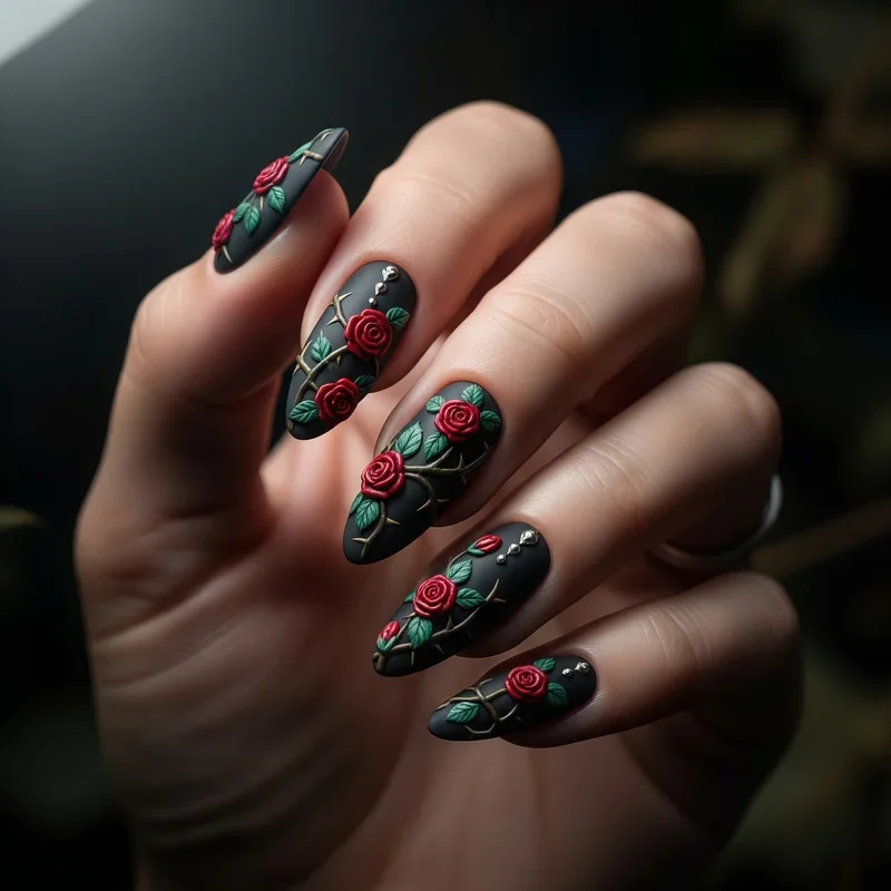 Combine the romantic symbolism of roses with gothic darkness to create a nail design that's hauntingly beautiful. Paint delicate black or deep burgundy roses against lighter backgrounds, or go for white roses on black for dramatic contrast. The thorny stems and withered petals add to the gothic narrative, telling stories of love lost and beauty in decay. You can use stamping plates for consistent rose patterns or try your hand at freehand painting for a more organic look. Adding small dewdrops with clear polish or tiny rhinestones brings these dark blooms to life. This design perfectly captures the gothic philosophy of finding beauty in darkness and decay. The rose has always been a symbol in gothic literature and art, representing both passion and pain in equal measure.