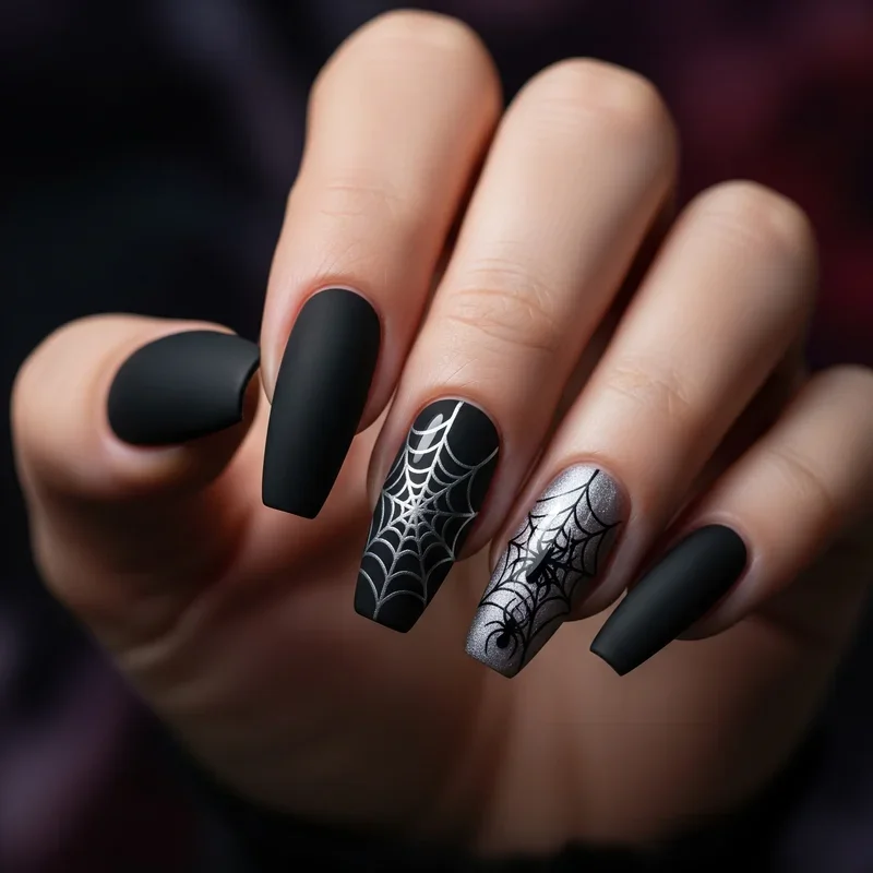Weave intricate spider webs across your nails for a design that's both delicate and decisively gothic. These geometric patterns require patience but deliver stunning results that capture the architectural beauty of spider silk. Start from a corner or center point and work outward with thin, precise lines using white or silver polish against black. The key is maintaining consistent spacing between web rings for a realistic look. You can add a tiny spider charm or painted spider for extra creepiness. This design works beautifully as an accent on ring fingers or can cover all nails for full gothic impact. The spider web represents patience, creativity, and the beauty found in nature's darker corners. In gothic symbolism, webs represent the intricate connections between all things and the delicate nature of existence.